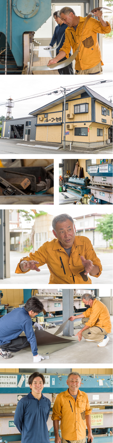 有限会社 ルーフ・セキ(天童市) 大工が造る躯体を体に例えるならば、 建築板金の仕事はそれに洋服を着せること。 建て方やデザインは時代と共に変化するが、 確かな技術で誠心誠意お客様に向き合う姿勢は、 100年経っても変わらない。 「地域の家を守る」 決意は、次世代へ受け継がれていく。 ※所属等は取材当時のものであり、現在と異なる場合があります。