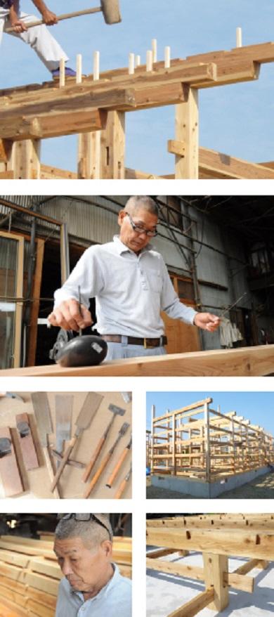 基礎は石場建て、構造材は地元の無垢材、継手・仕口にはできるだけ金物類を少なくし、壁の強度は筋違いではなく貫を多用する伝統的な家づくりにこだわっている。 高校を卒業後、東京の建設会社に勤務するが、進学して構造計算を学びたいという思いから退職。 「木の特徴やクセが構造に生かされており、昔の家は丈夫で長持ちする。それこそが大工の技」。先人の知恵と技術を追求するきっかけになった。 これまで10人以上の弟子を育ててきた剱持さん。弟子の中には息子の大輔さんもいる。大輔さんは父である剱持さんの意思を受け継ぎ、親子は2人3脚で伝統木構造と地材地建にこだわり続ける。 また、剱持さんは伝統技術を広めるNPO法人 伝統木構造の会のメンバーの一人としても活躍している。セミナーや講習会、実技指導などを展開し、全国各地を飛び回る日々を送っている。道具を使いこなし、木の特徴を見極め、適材適所に配置するといった本来持つ職人の姿を剱持さんは身を以て示している。熟練職人の挑戦はまだまだ続く。 |