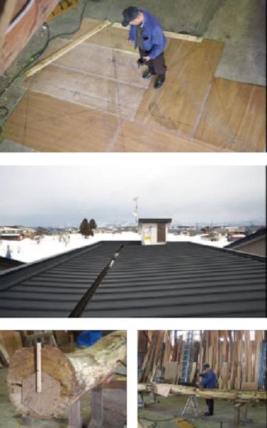 百年、二百年と歴史を刻む寺社建築の技は、住宅にも活かされる。無垢材にこだわり、プレカットではなく古来からの継ぎ手で木を組む。場所によって仕口も使い分ける。 庭に趣味で建てるという東屋の柱を刻んでいる現場を見せてもらう。不規則な形の丸太の中心取り、六角形の屋根を支えるため6方向に入れられる刻み、複雑な木組みや入り母屋づくりの屋根のそり(曲線)を作るために不可欠な原寸大の設計図「原寸出し」など、菅戸さんならではの匠の技が駆使されている。 無落雪屋根を手がけたのは昭和55年。北海道の事例をヒントに、まず自宅の屋根を改修して研究を始め、何年か様子を見てお客さんの家づくりにも採用していった。屋根にはボイラーを使ったヒートパイプを入れ、積雪そのものを軽減する。M型形状のため落雪や雪下ろし時の落下事故の心配もない。軒下を駐車スペースにすることもできるし、雪下ろし場所を確保しなくても済む。 その他にも、自邸を実験台にして、平屋を住みながら2階建てにするといったリフォーム技術を開発。 |