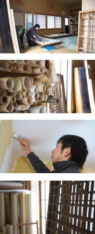 「師」は「匠」を意味し、洗練された熟練の腕が成す手仕事の粋、美術工芸品として、掛軸、巻物、経本、額、衝立、屏風、襖、障子といった日本古来からの和紙の文化を支えてきたのが表具師である。時代の移り変わりによりニーズも変化し、紙と糊と水を材料とする「張り」の技術は、インテリア、内装といった仕事に活かされ、今日に至っている。 第25回技能グランプリ「表具」部門で日本一。 四釜さんは、祖父から続く表具店の3代目。専門学校卒業後、さらに5年間、鎌倉の表具師のもとで修業を積んだ。神社仏閣の額装や屏風、掛軸、襖などを手がけながら、紙の選び方、糊の作り方など表具の様々な技法を学んだ。1枚に見える紙を何層にもはいでいく作業、ロール紙や大判紙などない和紙を、継ぎ目が分からないように継いでいく腕、それら表具師に不可欠な緻密な技術は、内装の仕事にもそのまま活きる。和紙の内装材は扱いが難しいからと、指名での依頼もあるそうだ。 内装の仕事と両立させながら、次の世代を育てたい。 作業場には、古い障子戸や板襖が紙を張る作業を待っている。何枚かの書画が掛軸になるのを待っている。「家が時代によって変化しても、表具の仕事は決してなくならない」と四釜さん。古いものはきれいに修復再生して後世に残すことができる。床の間がなくても洋間に合うような新しい掛軸にもチャレンジしたい。内装も含め表具師の仕事の幅と役割、可能性は広い。自分が納得できない仕事はお客さんも満足しない。だからこそ自分に厳しくありたい。そして、いつか自分が高めた技術を誰かに伝えたいのだという。 |