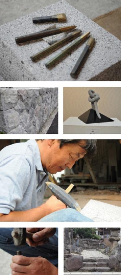 5年ほどの修行を終え、平成元年に戻ってきたが、すぐにお父さんが亡くなり、後を継いだ。実質、お父さんから石工職人としての技術を教わったことがなく、残された仕事をこなす為に父親と交流の深かった職人のみなさんから教わりながら無我夢中で仕事を覚えたと言う。 また、これからの石工職人は、加工技術だけでなくデザイン性を高める必要があるという。舩越さんは、自ら積極的な作品づくりも行っており、平成22年度開催の第65回県美展では、工芸部門で「山形放送賞」を受賞。平成25年度第68回県美展においても彫刻部門で入選している。 仕事柄、墓石がメインであるが、住宅の石垣づくりにも力をいれている。しかし、最近は石垣の石の積みが出来る石工職人が少ないと言う。 これからの石工職人は、「単にニーズに応えるだけでなく、いかに提案力を持つかが重要」と語る舩越さん。石工職人である自分たちがしっかりしたポリシーを持つことで、その姿が石工職人のブランド化になっていくという。 |