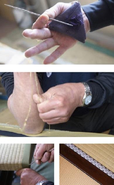 この職人時代、ほかの畳屋の仕事ぶりを真似、自分で研究と練習を積み重ね、自分のやり方を身に付けていったという。 段取り、畳を刺す時の体の置き方、スピード、どれもが独特の矢萩流。 たとえば、部屋は厳密にいうと当然ながら少しゆがんでいる。つまり台形だったり、ひし形だったりする。これに畳をぴしっと納めるため、どこが直角でないかを調べる寸法取りが不可欠。今はレーザーを利用した計測器があるが、矢萩さんが使うのはコンパスと「三四五」と呼ばれる直角三角定規だけ。しかも正確で早い。 また、畳刺しも早く、他の職人に比べ一日一枚ほど多い。 「無駄な手、ヘタな手は絶対に使わない。針当てに金属を入れないのはご飯もそのまま、作業ごとに外す必要もないので、時間を無駄にしないため」という仕事への徹底ぶり。 ちなみに、「針当て」とは手の平にはめて使い「針抑え」「手皮」などとも言い、裁縫でいう指ぬきのようなもの。針を押す時に手の平をケガしないよう金属を入れるのが普通である。 矢萩さんの刺し方には、まだまだ隠し技がある。畳職人の技がはっきり分かる角出し(角が下がらずきっちりと作ること)、待ち針が効かない厚さの畳を手差しする技…どれも長年の経験と技術の研究を重ねたゆえのもの。 「紙一重で、思ったように隙間なく納まった時は、ホームランを打ったような満足感があるね。それはお客様の満足につながる」 自分の腕に自信があるから、同業者がお互いの首を絞めるだけの値段競争はしない。これもまた矢萩流である。 |