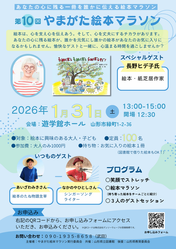 - 問い合わせ先:やまがた絵本マラソン実行委員会 TEL 090-1935-8658