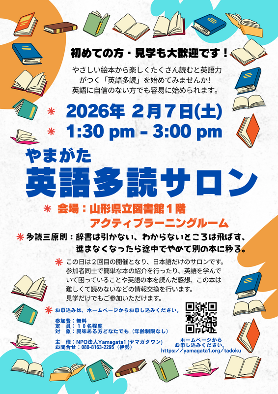 イベント やまがた「英語多読サロン」開催のお知らせ2026年2月2日やさしい絵本から楽しくたくさん読むことで英語力がつく、英語多読サロンを当館アクティブラーニングルームにて開催します。 初めての方や見学のみの参加も可能です。 ご興味のある方は下記URLよりお申し込みください。【申込URL】 リンク先はこちら 日時:令和8年2月7日(土)13:30~15:00 会場:当館アクティブラーニングルーム 対象:どなたでも 定員:10名程度