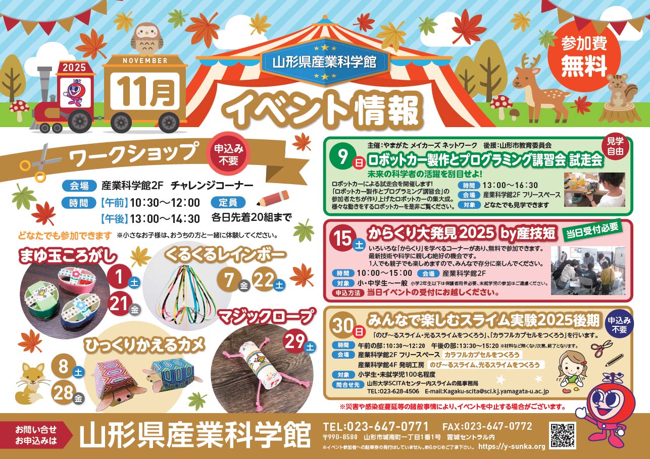 イベント 山形県産業科学館2025年11月のイベント情報2025年10月2日11月イベント[ロボットカー製作とプログラミング講習会 試走会、からくり大発見2025 by産技短、他] 山形県産業科学館2025年11月イベント情報.pdf
