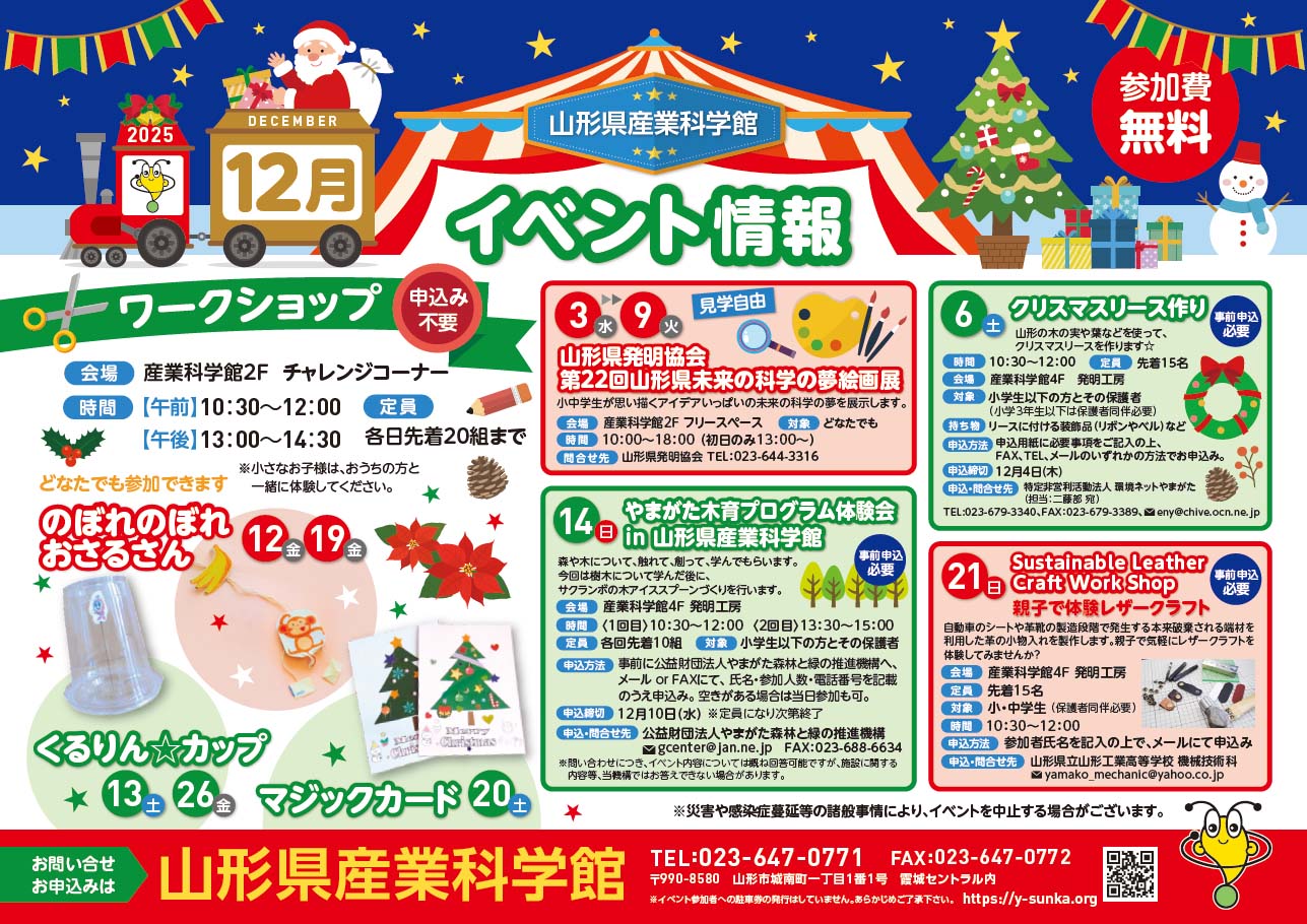 イベント 山形県産業科学館2025年12月のイベント情報2025年11月19日12月イベント[山形県発明協会 第22回山形県未来の科学の夢絵画展、Sustainable Leather Craft Work Shop 親子で体験レザークラフト、他] 山形県産業科学館2025年12月イベント情報.pdf