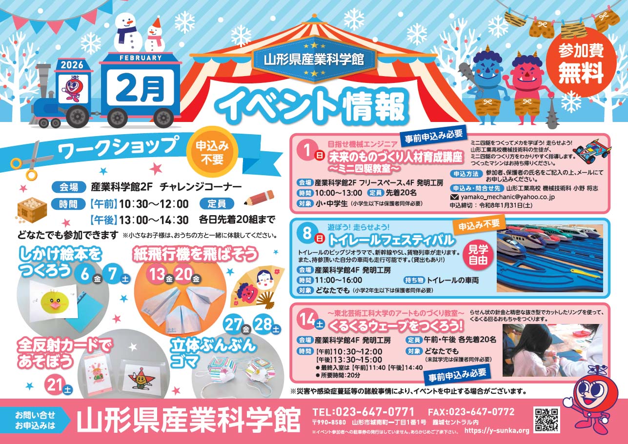 イベント 山形県産業科学館2026年2月のイベント情報2026年1月8日2026年2月イベント[未来のものづくり人材育成講座~ミニ四駆教室~、トイレールフェスティバル、くるくるウェーブをつくろう!、他] 山形県産業科学館2026年2月イベント情報.pdf