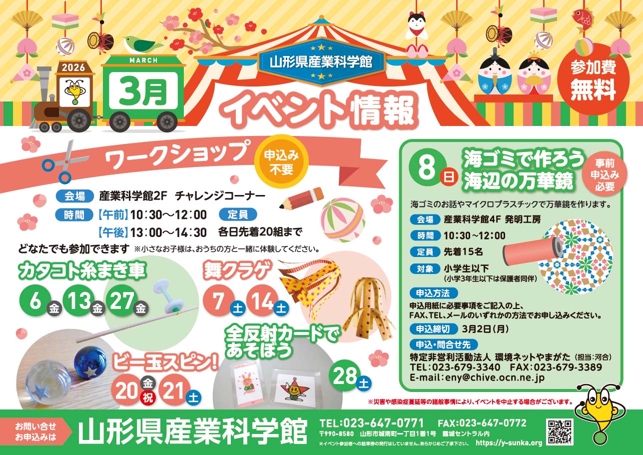 イベント 山形県産業科学館2026年3月のイベント情報2026年1月30日2026年3月イベント[海ゴミで作ろう海辺の万華鏡、ワークショップ:カタコト糸まき車、ビー玉スピン!、他] 山形県産業科学館2026年3月イベント情報.pdf