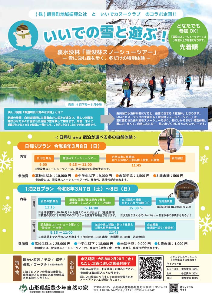 いいでカヌークラブが主催する「雪没林スノーシューツアー」は、雪に覆われた白川湖をスノーシューで歩く、冬にしかできない特別体験。