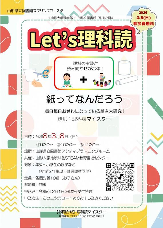 山形県立図書館では、山形大学理学部と連携し、理科読を用いた科学講座「Let’s理科読」を開催します。