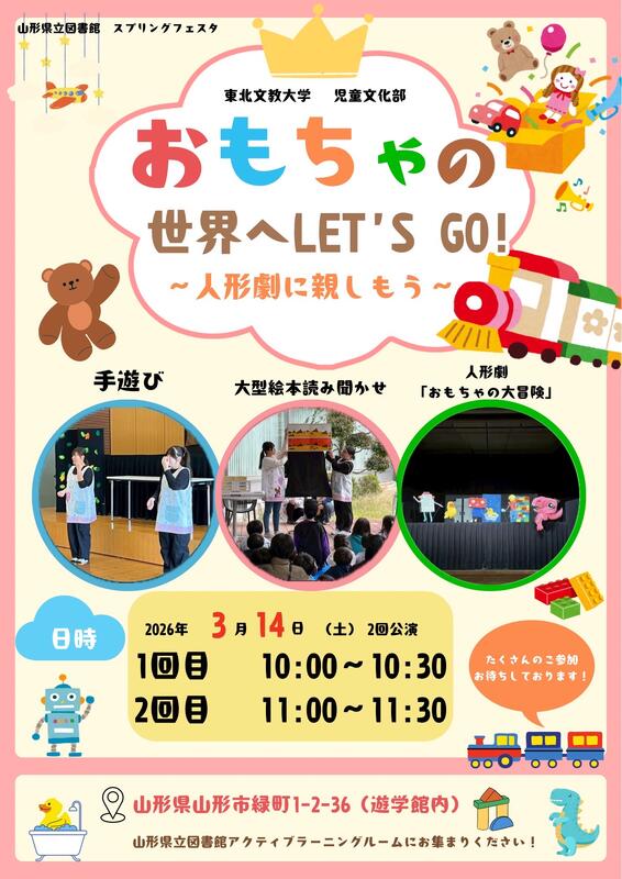 山形県立図書館では、東北文教大学児童文化部と連携し、標記イベントを開催します。人形劇や手遊びなどを取り入れた構成で、楽しみながらおもちゃの世界に親しめる内容となっており、登場人物のやりとりや動きを通して、参加者が自然と参加し、最後まで興味をもって楽しめるよう工夫しています。
